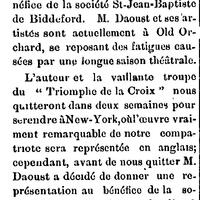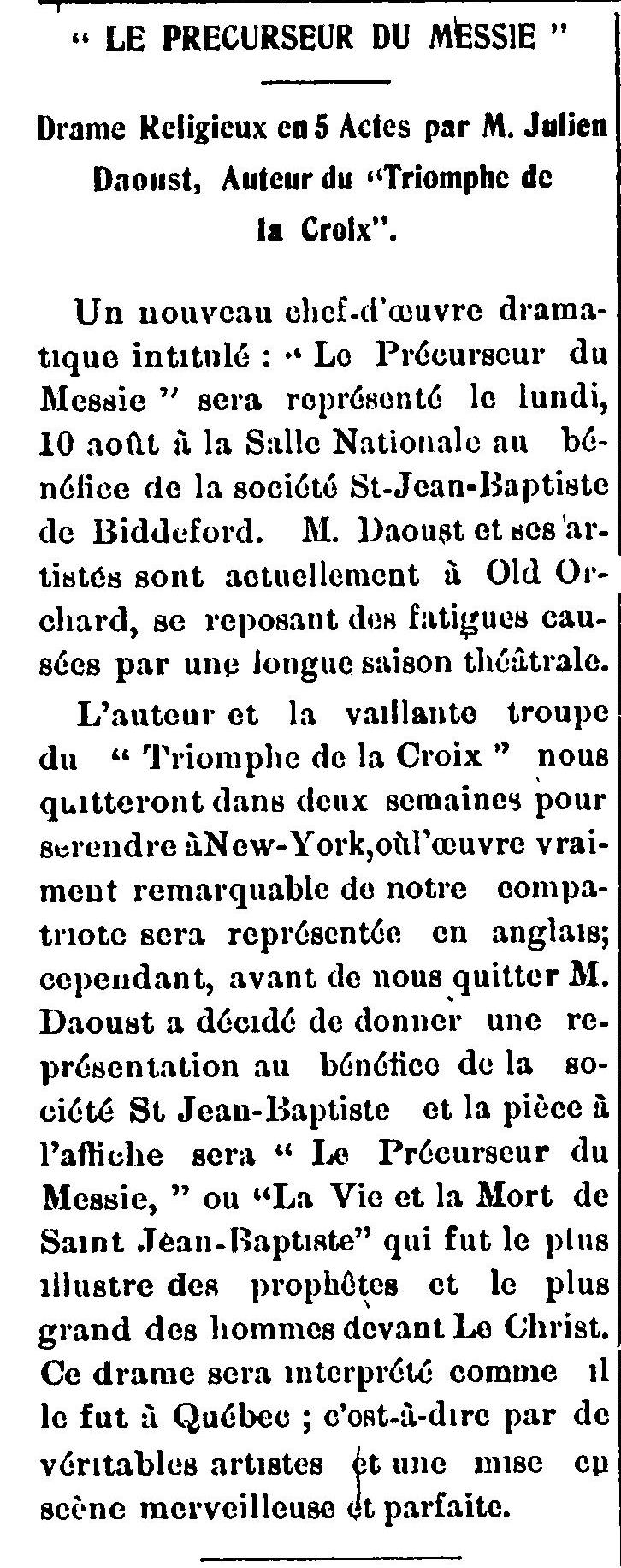 « "Le précurseur du messie" drame religieux en 5 actes par m. julien daoust, auteur du "triomphe de la croix" », La Justice (Biddeford, Maine) 30 juillet 1903, p. 07.