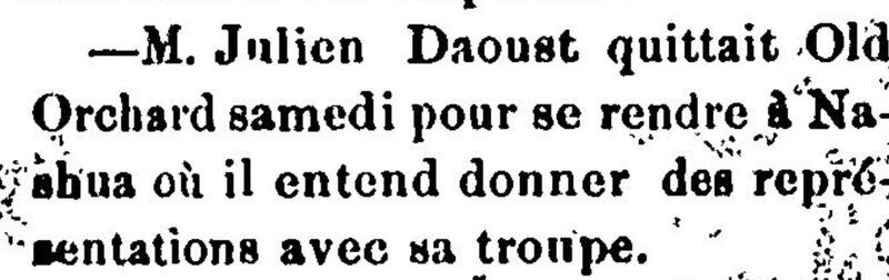 « La troupe de julien daoust quitte Old Orchard pour se rendre à Nashua », La Justice (Biddeford, Maine) 20 août 1903, p. 08.