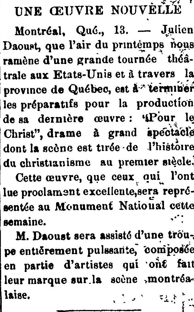 « Une oeuvre nouvelle : Pour le Christ », La Justice (Biddeford, Maine) 14 avril 1904, p. 01.